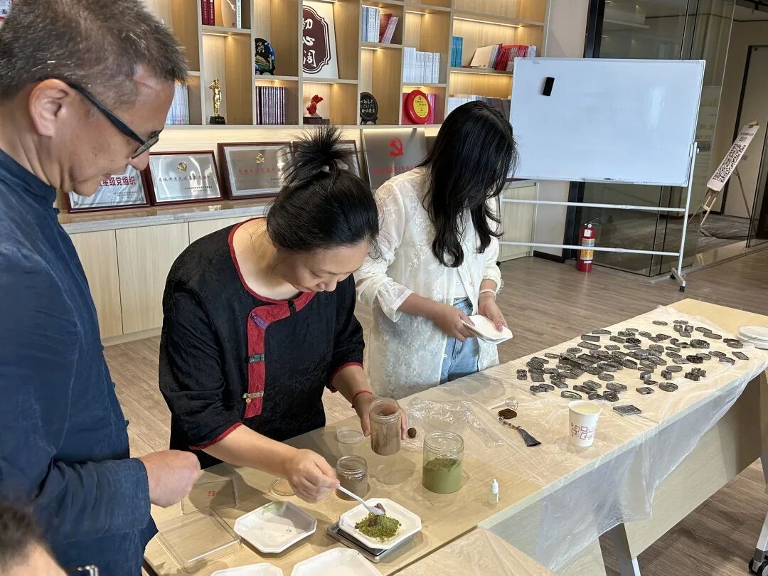 老师首先展示了各种精美的香牌样品,其独特的造型、淡雅的色泽和馥郁的香气,瞬间吸引了众人的目光,激发了大家亲手制作的浓厚兴趣。在制作环节,老师亲自示范,一步一步地教大家如何制作香牌。从香粉的调配比例、揉捏的力度到模具的使用技巧,老师都耐心细致地讲解和指导,确保每一位参与者都能掌握要领。党员群众围坐在一起,认真聆听、仔细观察,随后纷纷动手实践。沉浸在香牌制作的乐趣中。有的参与者专注地将香泥揉成圆润的形状,有的则发挥创意,用模具将香泥压制成精美的图案,还有的在香牌上精心雕刻出独特的花纹。在制作过程中,大家相互交流、互相帮助,现场气氛热烈而融洽。尽管大家的手法略显生疏,但每个人都充满热情,力求将自己的创意与心意融入到每一个香牌之中。最后,经过脱模、阴干等工序,一块块散发着淡淡香气的香牌便大功告成。