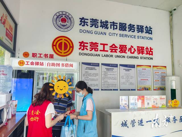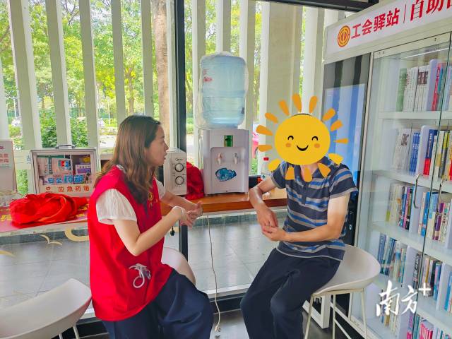 “外面天气很热,您先进来歇歇脚,喝杯水。”7月9日上午,东莞户外地面温度攀升,高埗广场工会爱心驿站门外一名男子引起了社工的注意。