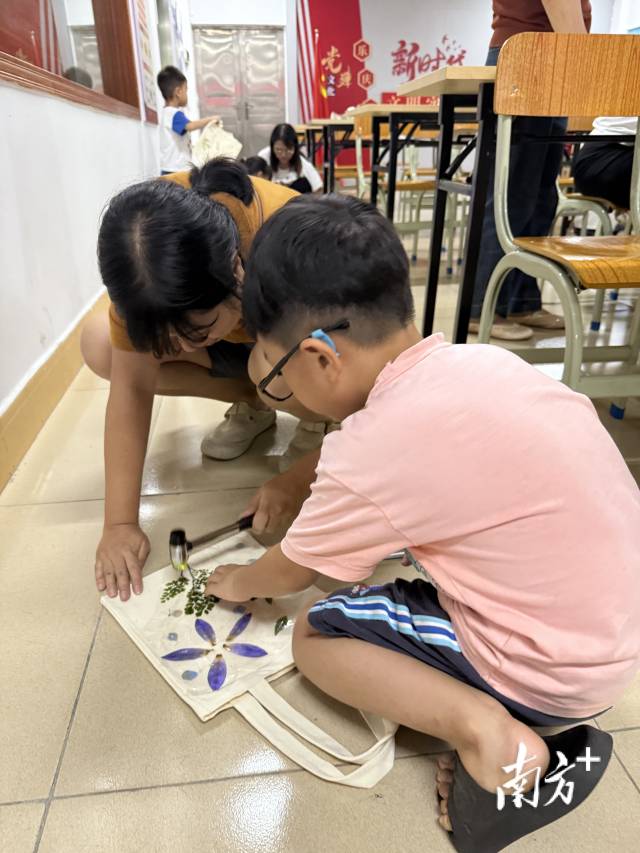 7月25日晚,小坑村社区文化中心开展了“自然印记智慧家风”手工亲子课堂活动,10余组亲子家庭在社工的引导下,用树叶、树枝、花瓣等天然材料与环保袋完成“自然印记”拓印。