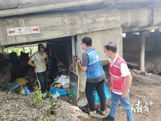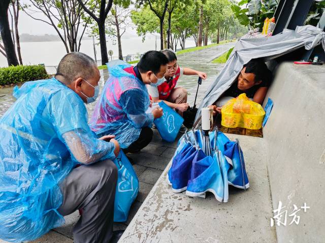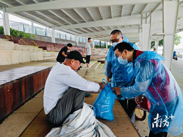 对于老熊和其他外展社工而言,台风天的救助早已不是第一次,但每一次他们都不敢有丝毫懈怠。早在台风预警发布初期,市救助站与外展社工就分组分别到东城街道、清溪镇、凤岗镇、黄江镇、樟木头镇等水道桥底、凉亭等有流浪人员的地方分头排查,劝导流浪人员去救助站避灾。对于不愿转移的流浪人员,则送上应急物资,提供就近避难场所的位置和服务内容,并转介给镇街公共服务办跟进,确保流浪人员在台风期间的安全保障。