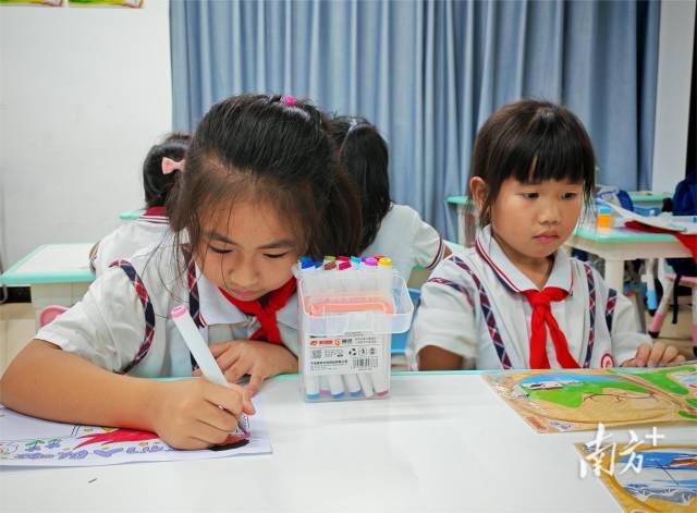 在手抄报环节,10岁的肖金正拿着彩笔认真比划。他告诉社工,为了画出满意的作品,刚才在知识课堂上特意记了队徽、队旗的细节,“我要把队旗画得再鲜艳一点!”