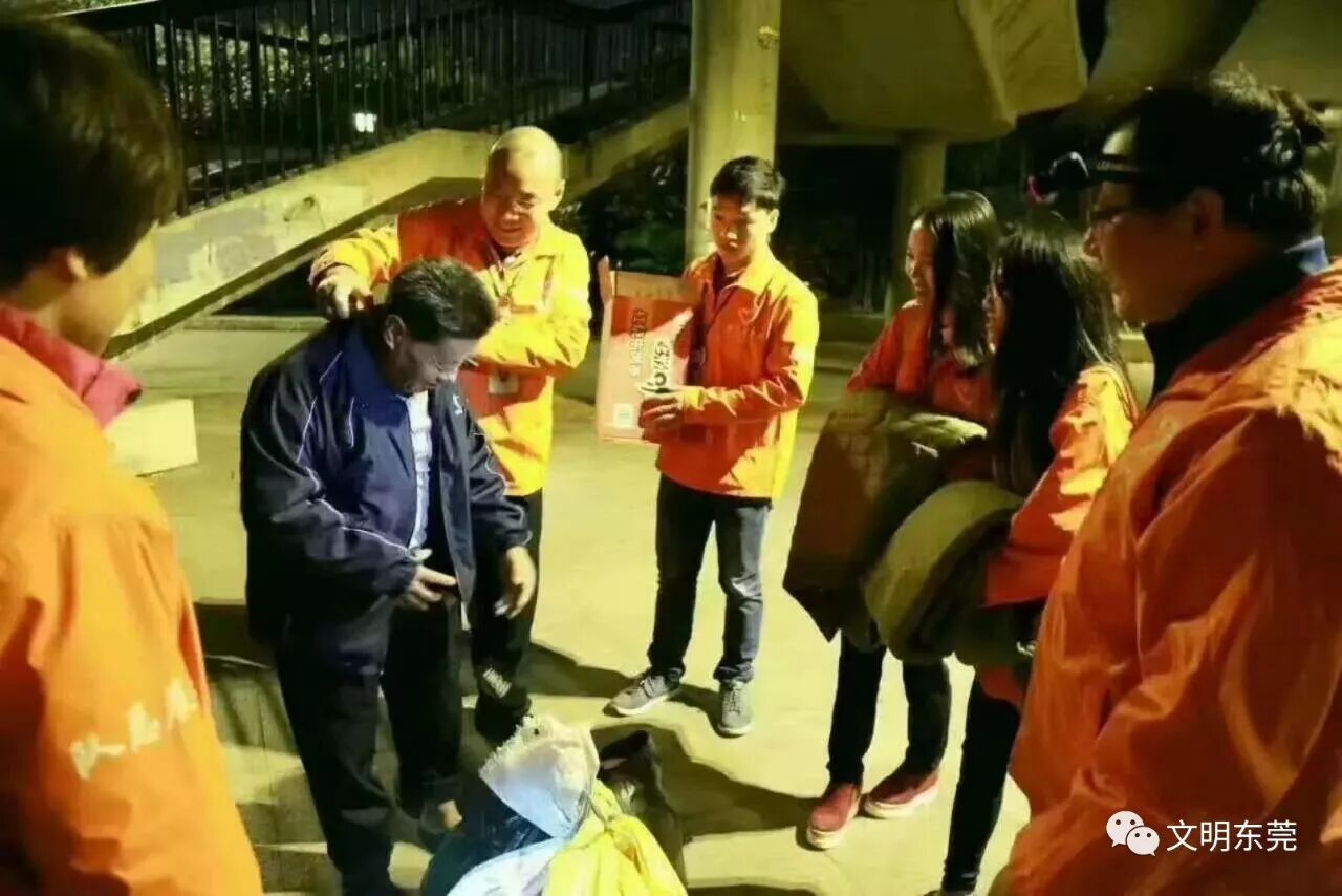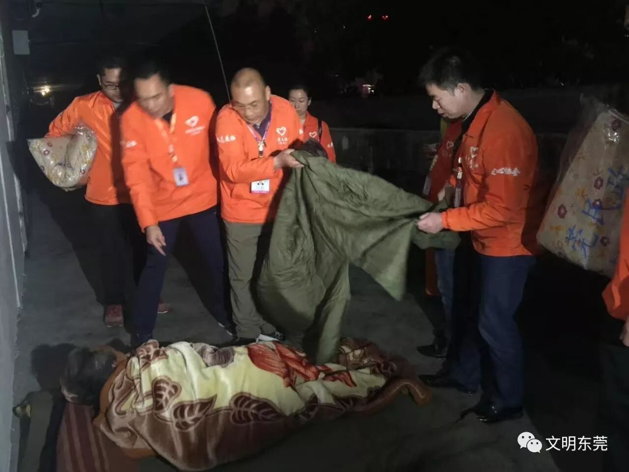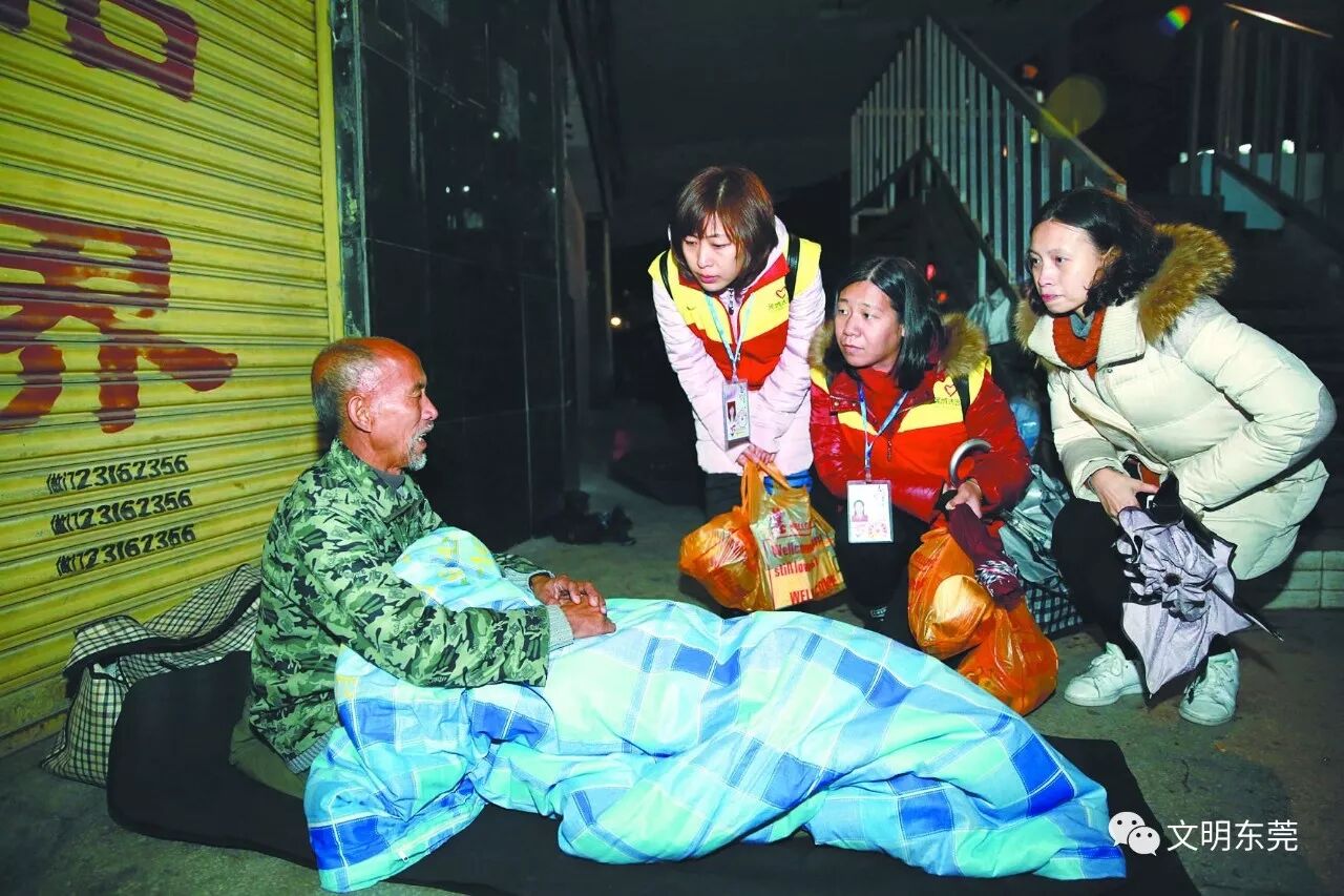 受冷空气影响, 连日来,东莞气温骤降, 北风凛冽。 1月8日东莞发布寒冷橙色预警信号 今日凌晨最低温度降至4℃ 在寒冷的季节里 东莞仍有游荡于街头巷尾的流浪乞讨者 靠单薄衣裳艰难度日 …… 为关爱这个特殊群体 1月8日晚,东莞市救助站、社工、志愿者 冒着寒风走上街头 为流浪者送上食物、棉被 开展“冬季送温暖”行动 劝导流浪乞讨人员和露宿者 到救助站过冬 为 流浪者 送食物和棉被 1月8日晚8时,东莞市救助站工作人员和社工、志愿者兵分四路,在莞城、东城、南城、万江4个街道进行“拉网式”搜寻救助流浪乞讨人员和露宿者,他们准备了军大衣、棉被、方便面、热水和保温杯,送给流浪者过冬物资。 市救助站工作人员和社工、志愿者开展“冬季送温暖”行动。出发前,一切准备就绪 为流浪者送上厚衣服过冬 给流浪者送棉被 在莞城八达路人行天桥旁边的大楼二层过道上,每隔两到三米就可以看到流浪者的身影。在一个拐弯的角落里,有位60多岁的流浪者露宿在店铺门前。他光着脚蜷缩在单薄的被褥里瑟瑟发抖。大家连忙走上前,给他盖上新被褥,并为他送上泡面。 这位流浪者靠拾荒为生,在此已有一年多了。“天气这么冷,要不要送你去救助站啊?可以免费吃住的。”市救助站负责人张相斌对他说,可流浪汉却摇摇头。大家只好叮嘱他要注意保暖,并向他发放了宣传单页,让他有需要时联系救助站。 给流浪者送上热水和食物 关切问候流浪者身体情况 再往前走10多米,一位头发花白、身体干瘦的老者睡在湿漉漉的地面上。经询问,他姓吴,今年快70岁了。大家送给他保温杯,并倒上热水,送去新被褥。对此,他对大家点点头表示感谢。 市救助站负责人张相斌表示,东莞“寒冬送温暖”行动从2017年11月15日开始,将持续至2018年3月15日。此次是2018年第一轮“寒冬送温暖”救助行动,旨在保障困难群众做好防寒保暖工作,及时开展街头救助行动,为街面流浪乞讨者提供救助服务。 确保 困难群众 吃得饱、穿得暖 据市气象部门预报,东莞8日起受寒潮影响,北风加大,气温急降。市气象台昨日12时07分将寒冷黄色预警信号升级为橙色,10-12日早晚气温仍低于5°C-7°C。 给流浪者分别送上棉被和食品 市民政局于1月8日14时启动低温冰冻灾害救灾预警响应。各镇街民政部门要切实做好防寒保暖工作。低温天气下,要切实保障困难群众和民政服务对象吃得饱、穿得暖。 给流浪者送上棉被和食品 目前,市民政局实行24小时值班,随时应对突发事件。市所有应急避灾场所全面开放,市救助站连同社工24小时进行路面巡查,劝导流浪人员进站接受救助,不愿进站的,发放棉衣、棉被和食品。各镇街(园区)组织多个探访慰问组深入困难群体家中进行走访慰问。 全市“寒冬送温暖”街面救助外展服务 已达 124 次 服务街面流浪乞讨人员 201 人 / 次 发放棉被 63件 棉衣 73件 毛毯 41件 保温瓶 22个 饼干 202袋 泡面 99份 饮用水 159件 以上数据截至2018年1月8日 市镇两级应急避灾中心开放 有需要的群众可就近求助 目前,东莞市一级的应急避灾中心设立在市救助站,可同时容纳1000人求助。而镇街应急避灾中心一般都设立在镇街敬老院、社区综合服务中心、学校等,可容纳几十人到五百人不等。有需要的群众,可以就近前去求助,对求助者没有任何户籍限制。 道滘镇御寒避灾点储备着棉被等应急物品 温馨提醒 如果您在街上发现有需要帮助的流浪乞讨、街头露宿人员,可通过电话或网络的方式联系驻救助站的街角社工进行报料。报料时请提供流浪乞讨人员的所在位置、外貌特征、精神状况等信息,并留下您的联系方式,街角社工将会第一时间与您取得联系,以便及时采取救助行动。